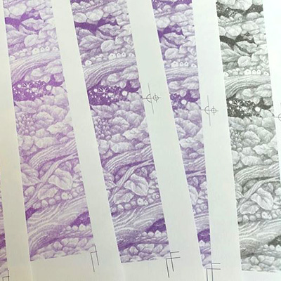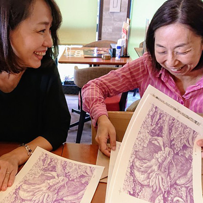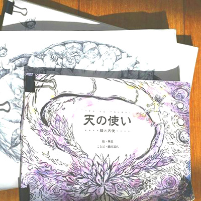 印刷は『空へのノート』に続き福岡の文林堂山田義之氏にお願いしました。こだわりの印刷職人です。今回、「すみれ色の本にしませんか?」とご提案いただきました。とても発色のいいマゼンダがあるからこのインクを使いたいんです。「龍も天使も実体のないものだから、龍も天使も花も全てが一緒の花畑のような本にしたいんです。あなたの作りたいものとは違うかもしれないんだけど私が作りたいんです。」とおっしゃってくださり、私は10万円ほど上がったお見積りとにらめっこしながらも山田さんのご提案に乗ることにしました。そして、私は、このすみれ色と織田さんのことば『むらさき』との偶然の符号にびっくりしたのです。山田さん!すみれ色大成功です。ありがとうございました。