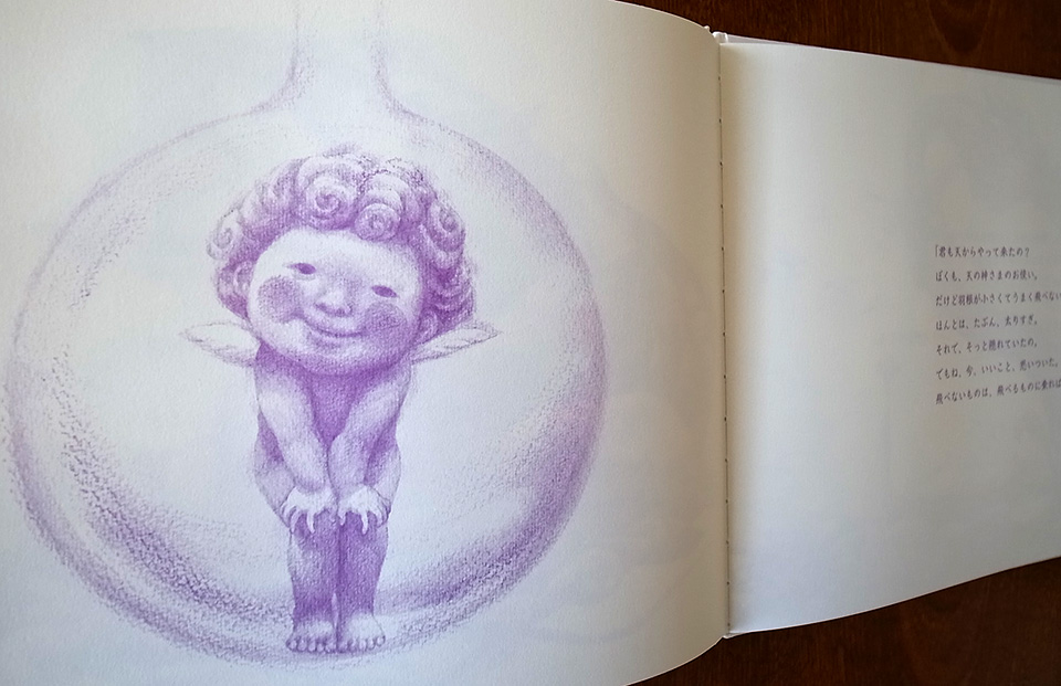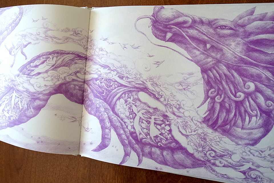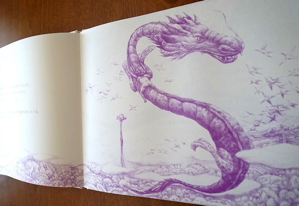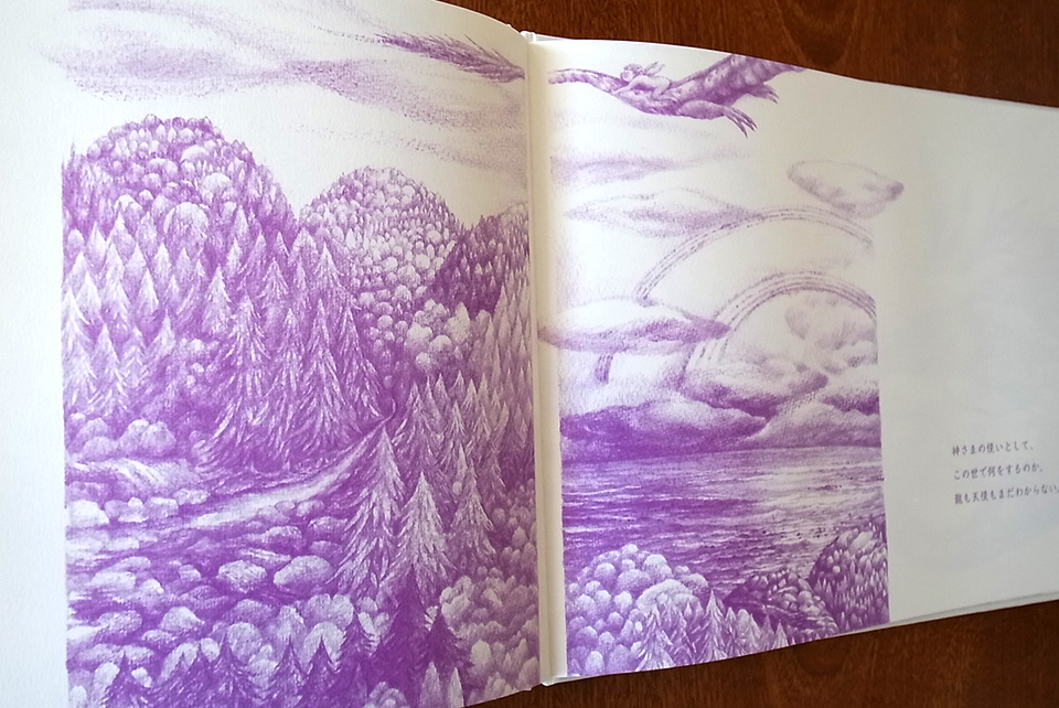 贈り物のような本になりました。次は龍をモチーフに制作していこうと、前作の『空へのノート』が完成した時にそれだけは決めました。最初にジュエリーメーカーCASHO近藤嘉さんとの出会いで龍がジュエリーになり、絵本へと繋がっていきました。絵本の中の龍は自分の道を見つけられず苦しんでいて、まだまだ半人前。龍神というよりは人間に近い存在として描かれています。私自身が受け継いだものと受け継がれていくように願うものを龍と天使に託しました。この絵本が龍と同じように自分の道を探している人の背中をポンと押せるようなものでありたいです。