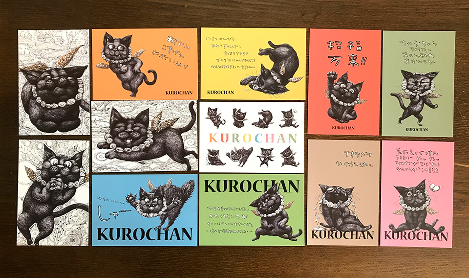 『ええにおいのするほうへ〜展』に合わせてくろねこくろちゃんのポストカードを作りました。カラー8種、モノクロ4種の全12種類です。